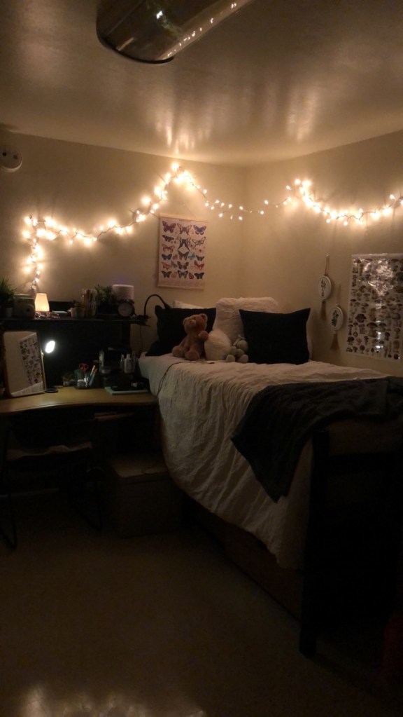 Personally, I hate overhead lighting. Like absolutely despise it. I would rather sit in the dark than have the big ugly yellow light shining down on me. That’s why I absolutely loved my fairy lights and desk lamp. As you can see above, I hung them around my desk and bed and had my lamp right next to my bed as well. I would just plug it in after class and the vibes were so nice. Having the lamp next to me was great too when I wanted to read!